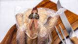 ②お急ぎの場合は、たらい等に水道水を満たし、そのなかに真空パックのままお肉を入れます。1時間ほどで解けるので水から上げ、パックから取り出して調理を始めてください。せめて20分でも空気に、あててあげると美味しく召し上がれます。